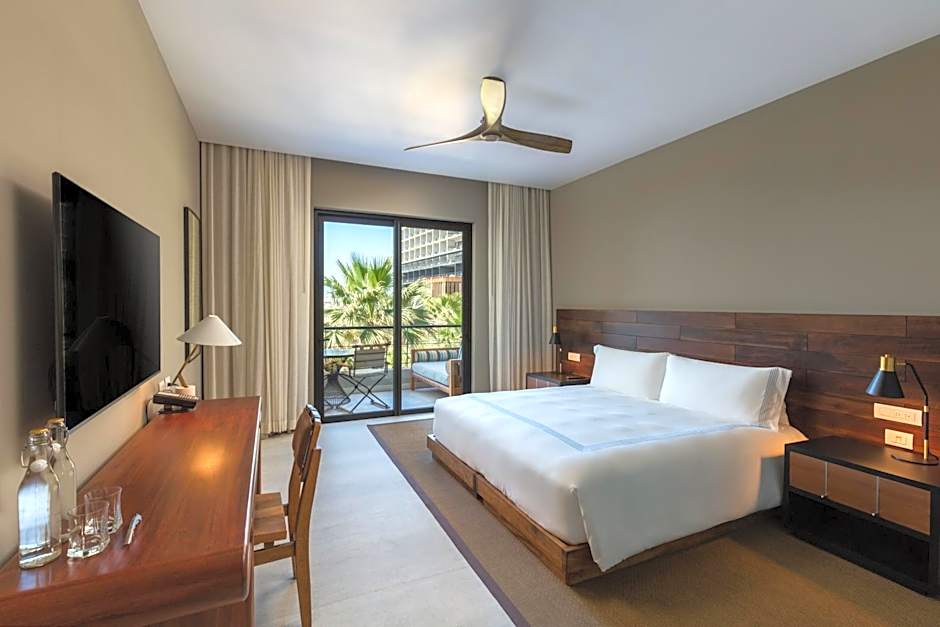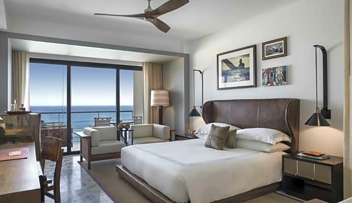 Private balcony with hanging daybed overlooking the ocean and El Arco